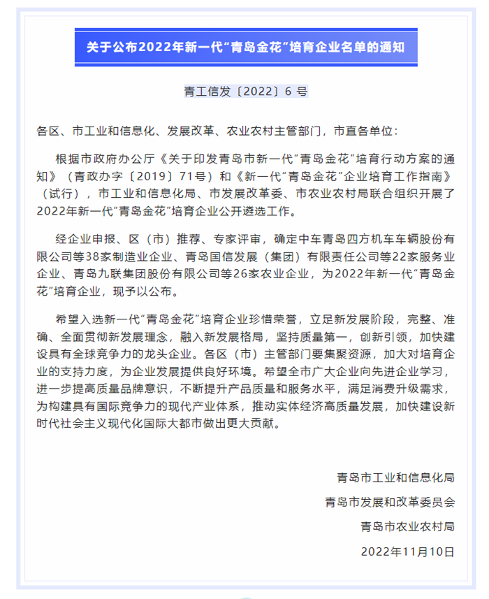 近日,從市工業和信息化局獲悉,青島明月海藻集團榮獲2022年新一代“青島金花”培育企業稱號,這是我集團連續四年獲此殊榮。據悉,該項榮譽由市工業和信息化局牽頭遴選,旨在遴選一批在行業中具有明顯規模優勢和競爭優勢、擁有高品牌知名度和品牌價值的企業,充分發揮企業的品牌影響力和主體作用,促進企業做大做強,推進產業創新發展。