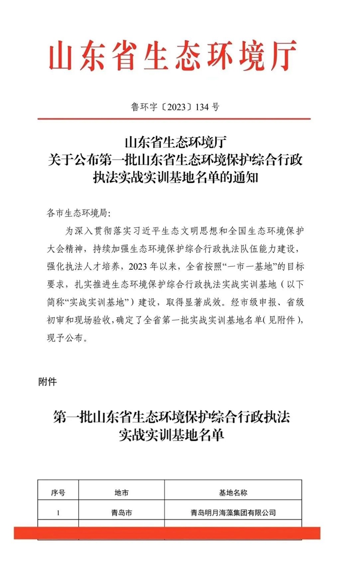 日前,青島明月海藻集團被山東省生態環境廳授予“首批山東省生態環境保護綜合行政執法實戰實訓基地”。