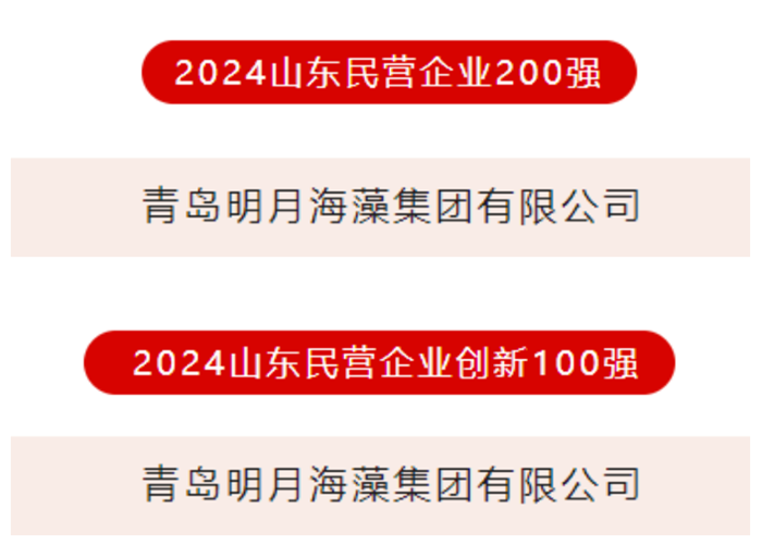 本次榜單由山東省工商聯、山東省發展改革委、山東省科技廳等多個部門聯合發布,經過企業申報、各市推薦、專家審核及成員單位意見征求等多輪嚴格篩選,最終確定了包括“2024山東民營企業200強”、“2024山東民營企業創新100強”在內的多項榮譽榜單。明月海藻集團憑借其在海洋資源開發、健康產業拓展及技術創新等方面的顯著成就,不僅入選了“2024山東民營企業200強”,還榮膺“2024山東民營企業創新100強”,展現了集團強大的綜合實力和創新活力。