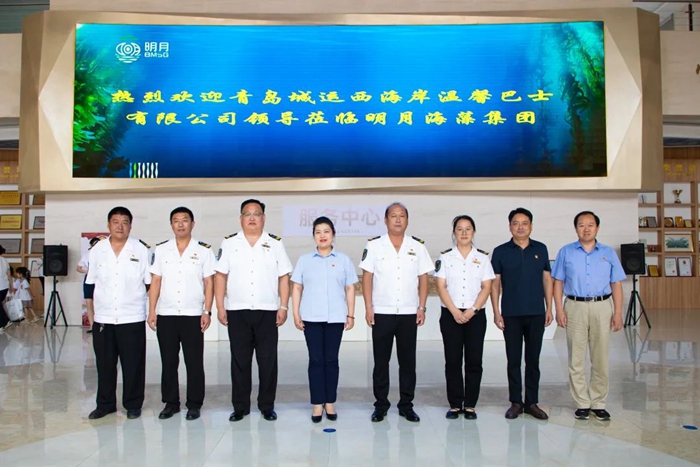 城運西海岸交通發展集團有限公司公交運營事業部副部長、西海岸溫馨巴士有限公司黨支部組織委員、工會主席任顯寶、城運西海岸交通發展集團有限公司公交運營事業部副部長、紀檢委員、安全總監李玉俊一行,在明月海藻集團黨委副書記、工會主席楊曉菁、健康科技黨支部書記劉振鋒、黨工群團中心主任封安波陪同下,參觀了中國海藻科技館、海藻部落、海藻健康舫,了解了明月海藻集團通過不斷提升海洋新質生產力,把一棵小海藻做成一個大健康產業的創新發展之路。