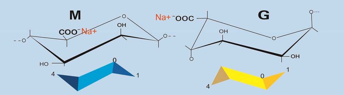 海藻酸鹽是存在于海帶、巨藻等褐藻中的一種天然多糖類物質,是藻體中的海藻酸與海水中的礦物質生成的天然產物,海藻酸是由甘露糖醛酸(M)和古洛糖醛酸(G)組成的混聚多糖。應用廣泛的海藻酸鹽產品主要有海藻酸鈉、海藻酸鉀、海藻酸鈣、海藻酸銨等。